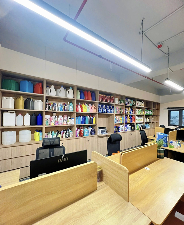 Phòng họp được đầu tư trang thiết bị công nghệ cao, đảm bảo sự kết nối thông suốt và hiệu quả cho các quyết định chiến lược. Bên cạnh đó, khu vực trưng bày sản phẩm mẫu là nơi khách hàng có thể trực tiếp trải nghiệm sự đa dạng sản phẩm và chất lượng bao bì chỉn chu của Sheenycos.