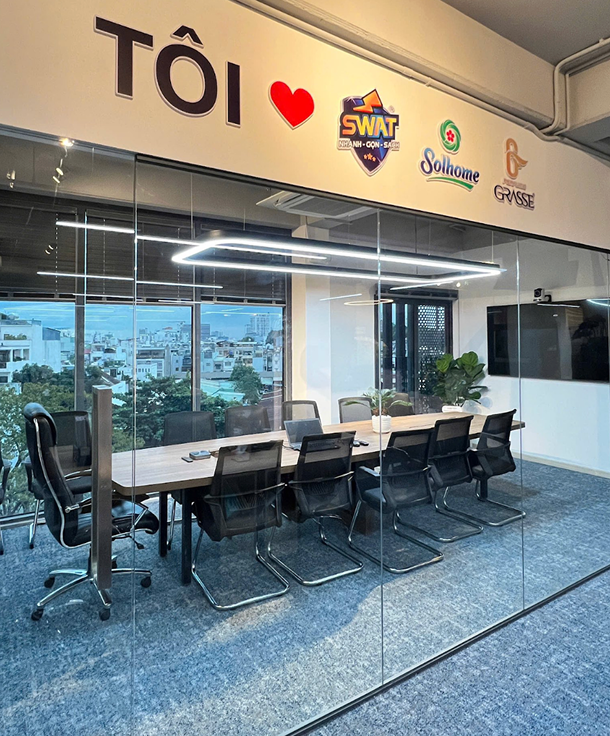 Phòng họp với bàn dài sang trọng, ghế ngồi tiện nghi và màn hình trình chiếu lớn, sẵn sàng cho những ý tưởng đột phá và quyết định chiến lược.